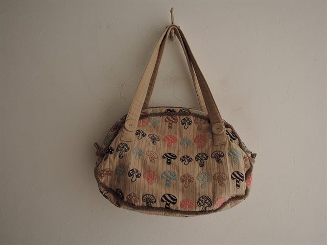 デザイン:mina perhonenのpolka クラウドバッグです。カラーはライトベージュベースに、ライトブラウン・パープル・グリーン・ピンク等のカラフルなキノコの刺繍があしらわれており、サイド周りはボアのパイピングが施されております。開口部はジッパー開閉で、内側はブラウンの裏地にオープンポケット×2付きです。素材は表地・刺繍・裏地共にコットン100%です。