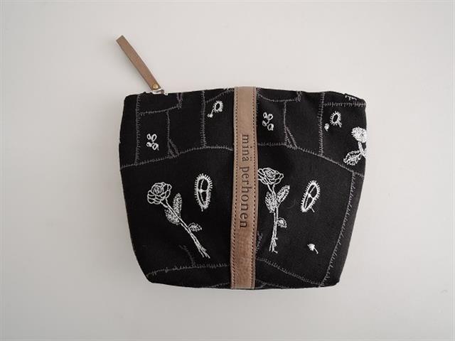 デザイン:mina perhonenのgarden patchwork チャパタポーチです。カラーは濃紺地にホワイトで刺繍が施されたデザインで、フロントにはロゴが型押しされたブラウンベージュのレザーテープがあしらわれています。開口部はファスナーで、内側にはグレー系の『sleeping rose』の裏地とポケットが1つございます。素材は表が麻100%、刺繍部分が綿100%です。