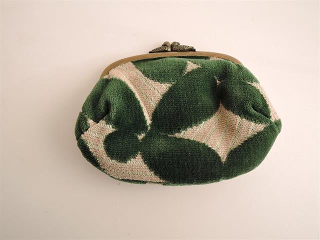 デザイン:mina perhonenのleaf カドルパースです。カラーは薄いグリーン化稀有rベージュの柄織り地に、グリーンのパイル刺繍が施されたデザインで、開口部はくすんだアンティークっぽいゴールドのがま口です。金具部分には小鳥のモチーフが飾られており、内側には光沢のある暗い黄土の裏地があしらわれ、ダークグリーンのレザーを使用したがま口ポケットが付いています。