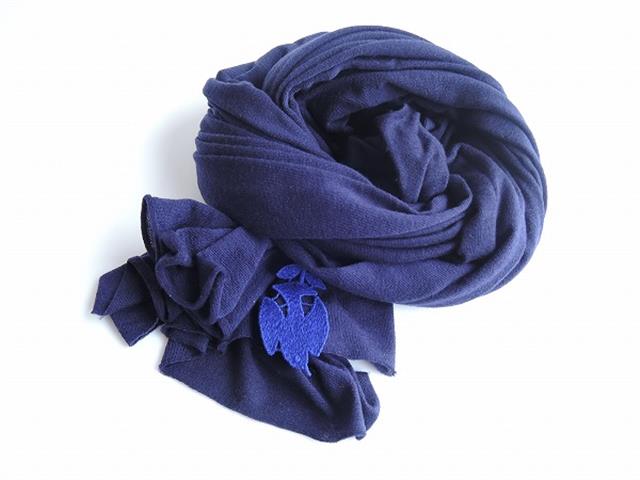 デザイン:mina perhonenの大判ニットストールです。カラーはネイビーで、柔らかな薄手のニット地で仕立てられています。縁は裁ち切りデザインで、バード刺?モチーフが付いております。素材は品質タグがない為分かりませんがカシミヤのような素材かと思われます。