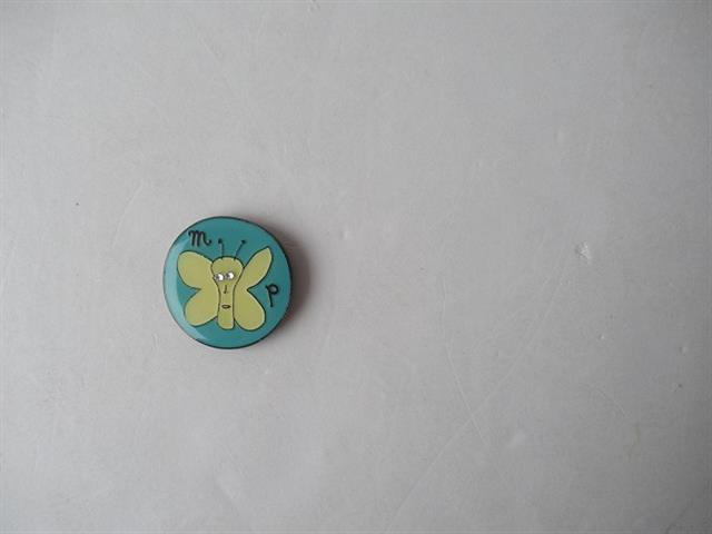 デザイン:mina perhonenのペルホちゃんブローチです。カラーはグリーン×黄色の円形のブローチです。