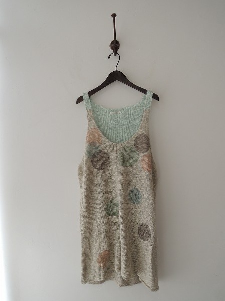 デザイン:mina perhonen 「shabondama」のニットワンピースです。シルバー×オフホワイトのやや薄手のミックスニットに淡いカラーのグリーン・ピンク・ブルー・ブラウングレーのドット柄の顔料プリントが施されております。 (掲載写真は、実商品のカラーにできるだけ近づけるよう努力はしておりますが、お使いのモニターや画面設定等によっては、色が異なって見える場合もございますので、予めご了承下さい)