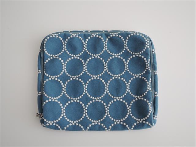 デザイン:mina perhonenのtambourine ポーチです。カラーはくすんだ濃いめ水色地にホワイトで刺繍が施されたデザインで、開口部はファスナーです。内側にはベージュ系の『sleeping rose』の裏地とポケットが1つ付いています。素材は表生地がポリエステル65%・綿35%、刺繍部分・裏生地が綿100%です。