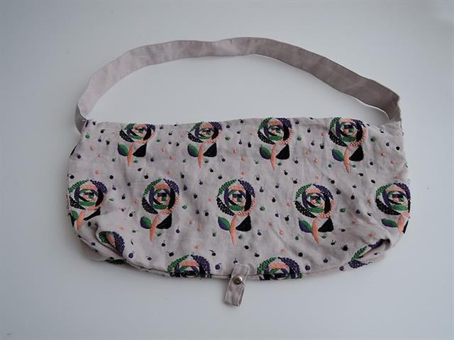 デザイン:mina perhonenのsand ROSE ボディバッグ小です。カラーはライトグレー地にブラック・パープル・グリーン・薄いサーモンピンクで刺繍が施されたデザインで、開口部はファスナーです。内側にはグリーンの裏地とポケットが1つ付いており、素材は表生地が麻100%、刺繍部分・裏生地がともに綿100%です。本体価格は23,000円+税です。