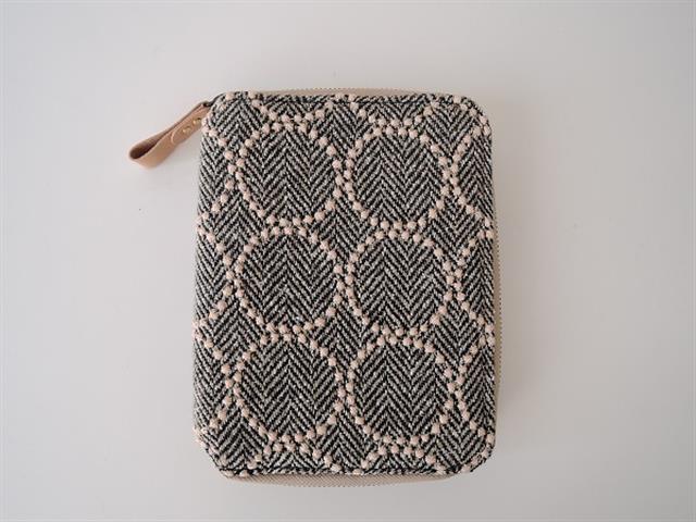デザイン:mina perhonen×HOBONICHIのtambourineジッパーズオリジナル手帳カバーです。カラーはブラック・ベージュ・オフホワイトのヘリンボーン織り地に、ヌードベージュで刺繍が施されたデザインで、ウールっぽい肌触りです。ラウンドジッパー開閉で、内側にはピンクベージュ×ベージュの異素材が使用されています。ポケットは大小9つあり、ブックマーク2本・ペン差し1本付きです。