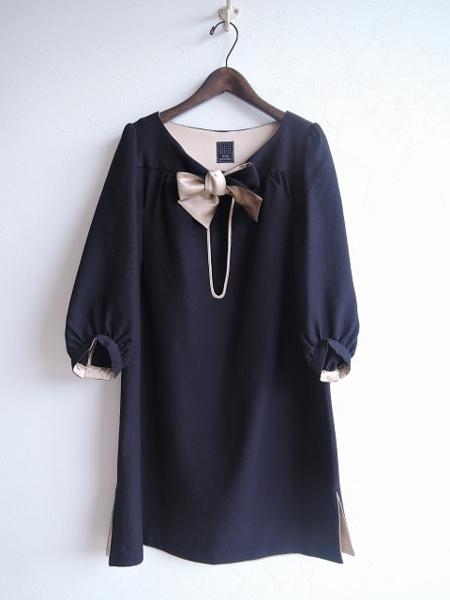 デザイン:mina perhonen 「Lhasa」のワンピースです。カラーは濃紺で、フロントには深めの開きがあり、ネックには裏がベージュのシルク素材があしらわれたボウタイが施されています。ポケット&裏地はなく、裾両サイドには15cmのスリット入りです。 (掲載写真は、実商品のカラーにできるだけ近づけるよう努力はしておりますが、お使いのモニターや画面設定等によっては、色が異なって見える場合もございますので、予めご了承下さい)
