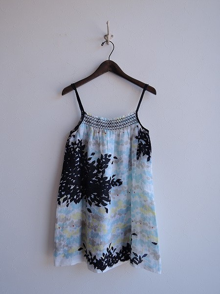 デザイン:mina perhonen 「water lily」のプリントガーゼキャミソールです。カラーはホワイト・ネイビー・サックス・ライトグレー・ライトイエロー・レッドなどで、総柄プリントのリネンガーゼ地であしらわれております。トップはネイビー&サックスのスモッキング刺繍が施されており、裏地は付いておりません。(掲載写真は、実商品のカラーにできるだけ近づけるよう努力はしておりますが、お使いのモニターや画面設定等によっては、色が異なって見える場合もございますので、予めご了承下さい)