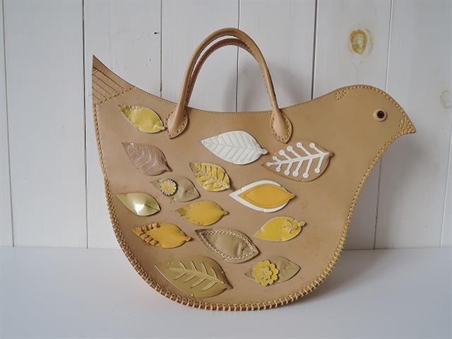 デザイン:mina perhonenのtori bag とりバッグです。カラーはサンドベージュのレザーで、フロントにはイエロー・アイボリー・ベージュ等のレザーやパテント等意素材のリーフモチーフやステッチが施されたデザインです。
