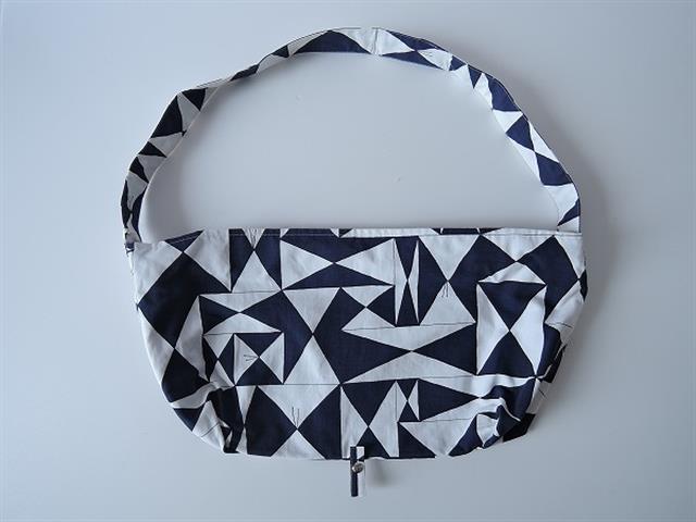 デザイン:mina perhonenのperhonen puzzle ボディバッグ小です。カラーはホワイト×ネイビーの幾何学模様のような蝶々がプリントされたデザインで、開口部はファスナーです。内側にはライトグレーの裏地とポケットが1つ付いており、素材は表生地が綿52%・麻48%、裏生地が綿100%です。