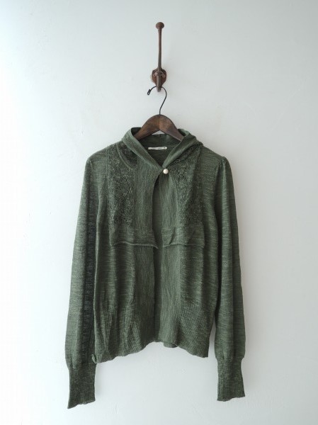 デザイン:mina perhonen 「sorbet」のフード付き絹混カーディガンです。カラーはモスグリーンのミックスで薄手のニットであしらわれております。フード&フロント肩部分は透かし編みで施されており、フロントにはパールのようなミラーボールボタンが1つ付いております。(掲載写真は、実商品のカラーにできるだけ近づけるよう努力はしておりますが、お使いのモニターや画面設定等によっては、色が異なって見える場合もございますので、予めご了承下さい)