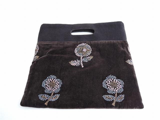 デザイン:mina perhonenのchum フラッグバッグ小です。カラーはダークブラウンのコットンベルベット生地に、グレーブラウン・グレーブルー・薄めの黄土でお花の刺繍が施されたデザインで、上部はブラックの異素材の生地に切り替えられています。開口部はマグネットボタン留めで、内側にはグレー系の『sleeping rose』の裏地とポケットが1つ付いています。素材は表生地ベース・パイルがともに綿100%、刺繍部分が綿76%・レーヨン24%、別布部分(dop)がポリエステル65%・面35%、裏生地が綿100%です。本体価格は13,000円+税です。