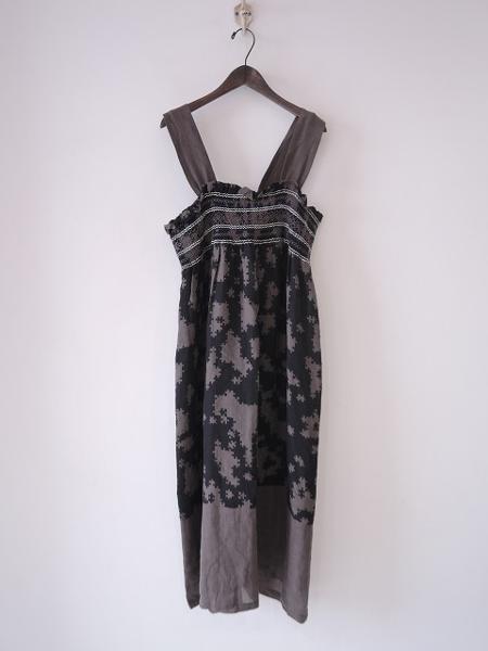 デザイン:mina perhonen 「puzzle」のキャミソールワンピースです。カラーはグレー系×ブラックで、薄手の素材であしらわれております。胸周りにはシャーリングゴム&スモッキング刺繍が施され、肩ひもは後ろボタンで2段階調節ができます。裏地付きです。 (掲載写真は、実商品のカラーにできるだけ近づけるよう努力はしておりますが、お使いのモニターや画面設定等によっては、色が異なって見える場合もございますので、予めご了承下さい)