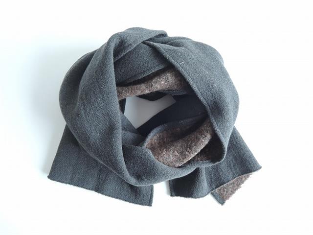 デザイン:mina perhonenのchoucho マフラーです。カラーはダークグリーンで、薄ピンクのchoucho刺繍が施されたデザインで、内側はブラウンミックスの起毛した素材になっております。素材は品質タグが付いていないため分かりません。