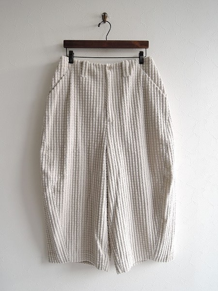 デザイン:mina perhonenのmoss seed コーデュロイパンツです。カラーはライトグレージュで、ブロック状のコーデュロイの凸凹感が特徴的なテキスタイル地で仕立てられており、裏地が付いております。フロント開口部はジップフライ仕様で、ポケットは4つ、やや丸みのあるワイドなシルエットになっております。本体価格は50,000円(税抜き)です。