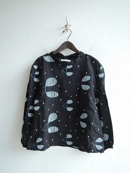 デザイン:mina perhonenのplover 刺繍リボンリネンブラウスです。カラーはブラックで、リネン地で仕立てられ、ホワイト&ブルーのテキスタイル刺繍が施されています。衿ぐりにはリボンひもが付いており、衿ぐり左サイドにループボタン付きのプルオーバータイプの着脱です。