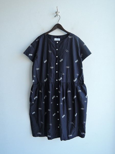 デザイン:mina perhonenのchouchoドレスです。カラーは濃紺で、オフホワイトの刺繍があしらわれており、程よいハリ感のある高密度な薄手生地で仕立てられており、フロントボタン開閉です。両腰辺りにポケットがございます。