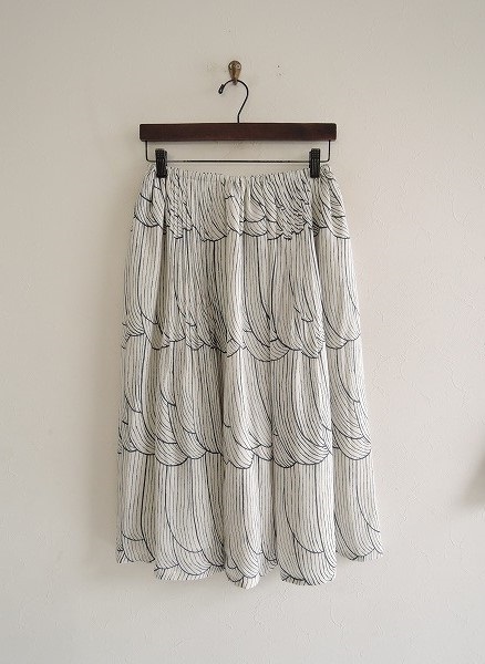 デザイン:mina perhonenのsulka シルクスカートです。カラーはオフホワイトベースに、ネイビーのテキスタイルプリントが施されたシルク素材で仕立てられています。ウエストはゴム仕様で、裏地付きです。定価は63000円+税の商品です。
