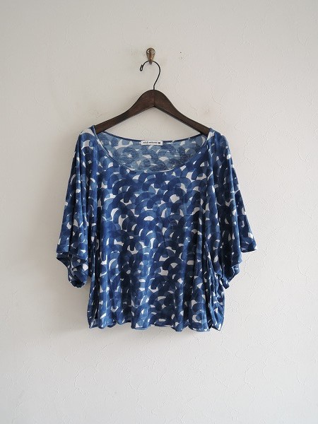 デザイン:mina perhonenのaalto コットンプリントカットソーです。カラーはネイビーブルー系×ホワイトのテキスタイルプリントが施されたTシャツ地で仕立てられています。プルオーバータイプの着脱で、後ろ裾にゴムが施された前後差のあるデザインです。