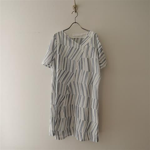 デザイン:mina perhonenのwind wall コットンプリントVネックドレスです。カラーはオフホワイト×ブルーグレーで、大陸を渡る風が大山脈を抜けるとき、風が岩肌に散らされて幾重にも層になっていく様子を描いたテキスタイルプリントです。薄手生地で仕立てられており、変形Vネックデザインで、中央斜めにタックが施されております。