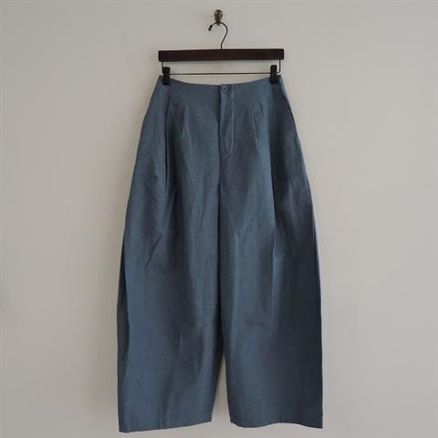デザイン:mina perhonenのhiekka コットンリネンタックギャザーワイドパンツです。カラーはグレーがかったミックスブルーで、シャリ感のあるネップ入りの素材です。ウエストにタック&ギャザー、両サイドにボックスタックが施されたワイドなデザインです。フロントのボタン&ジッパーで着脱でき、腰両サイド&右ヒップにポケットがございます。定価41,800円の商品です。