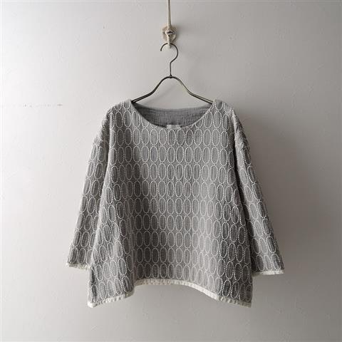 デザイン:mina perhonen laundryのporcelainブラウスです。カラーはグレー系×アイボリーで、オーバルが連なるテキスタイル刺繍があしらわれており、二重ガーゼ生地で仕立てられています。プルオーバーデザインで、袖口と裾にパイピングが施されており、本体価格30,000円(税抜き)の商品です。