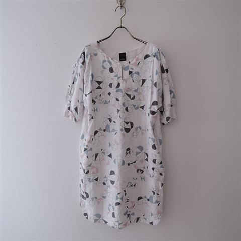 デザイン:mina perhonenのcosmo リネンプリントドレスワンピースです。カラーはホワイトで薄手生地で仕立てられており、チャコールグレー・ライトピンク・ライトブルーグレー等で、 星が宇宙に浮遊する様子のプリントがあしらわれております。袖丈は6分くらい、両サイドはタック入りで、両腰にシームポケットが付いております。定価65,100円(税込み)の商品です。
