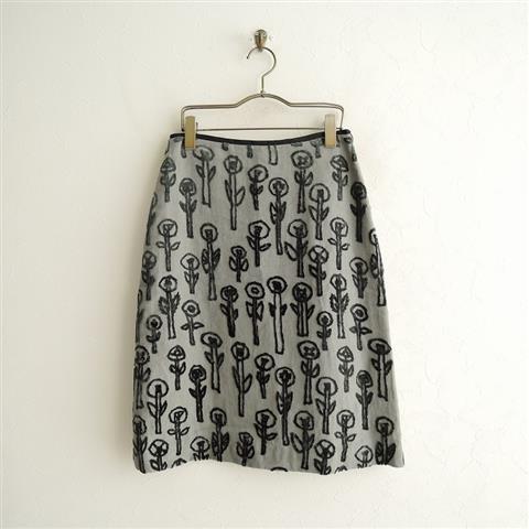 デザイン:mina perhonenのday dream パイル刺繍リネン台形スカートです。カラーはグレーでシャリ感のあるリネン地ベースにダークグリーングレーでお花のパイル刺繍があしらわれております。左腰ファスナー開閉で着脱でき、裏地が付いております。