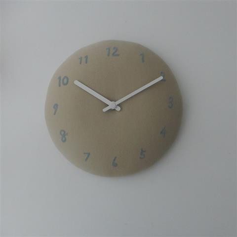 デザイン:mina perhonenのbolo 壁掛け時計です。カラーはライトベージュのdop地に、ライトグレーのフロッキープリントで文字盤が描かれており、ホワイトの針が合わせられています。中綿入りのふっくらとしたお品で、本体価格は15,000円+税です。設置用ネジが1つ付いています。