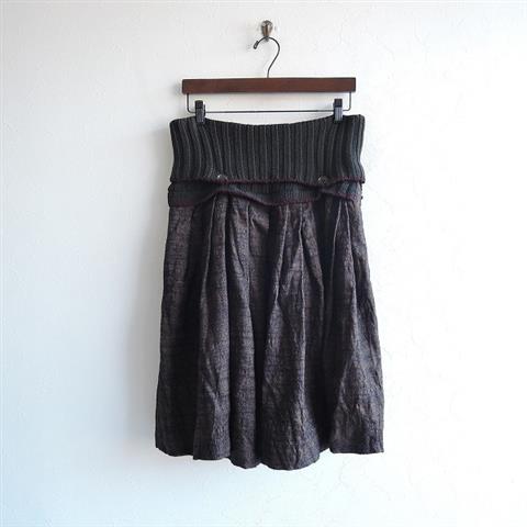 デザイン:mina perhonenのboulangerリブ切替スカートです。カラーはライトブラウン×黒の起毛感のある織地に黒の刺繍があしらわれており、ウエスト周りはダークグレー×ボルドーのリブニット地に切り替えられています。左サイドにファスナーが付いており、オフホワイト×ピンクの総柄の光沢感のある裏地付きです。