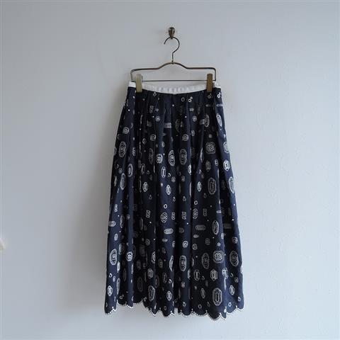 デザイン:mina perhonenのgemma タックスカートです。カラーはネイビーで、太さの異なるシルク糸、コットン糸、ラミー糸を、小さなチェックのように織り交ぜた生地で仕立てられ、光に満ちた宝石を刺繍で表現したデザインです。左腰フック&ファスナーで着脱でき、裾はスカラップライン、一粒だけ赤いスワロフスキーが施されています。裏地付きで、定価は66000円+税の商品です。