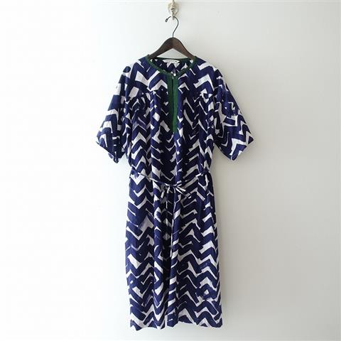 デザイン:mina perhonenのyamanami コットンプリントドレスシャツワンピースです。カラーはネイビー×ホワイトで、山の連なりや海の波を思わせるプリントの薄手生地で仕立てられております。襟元はグリーンのパイピングが施され、ひとつボタン留めで大きめの開きになったデザインです。ゆったりとしたワイドなシルエットになっており、両腰にシームポケット付き、共布の腰紐が付いております。