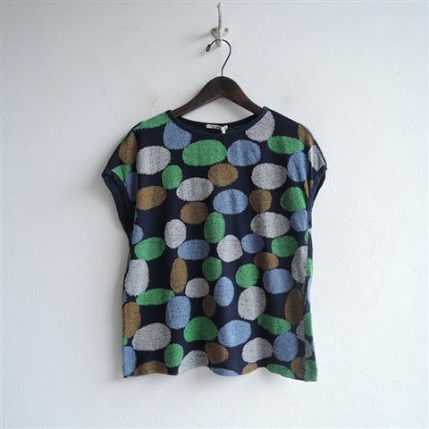 デザイン:mina perhonenのriver bed ジャガード刺繍カットソーです。カラーはネイビーベースの薄手ニット地で、グリーン・ライトブラウン・ホワイト・ライトブルーで床に敷き詰まった小石たちに陽の光が射しこんで反射している様子のジャカード編みが施されております。定価14,700円(税込み)の商品です。