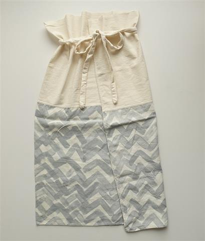 デザイン:mina perhonen×momogusaのyamanamiサロンです。カラーはキナリ色の無地&ホワイト地にグレーのプリントで、コットンタッサ風の生地と、糸節混じりのシャリ感がある生地の切替えです。別途腰紐付き。筒状のスカートで、ウエスト・着丈は調節可能です。ポケットはございません。