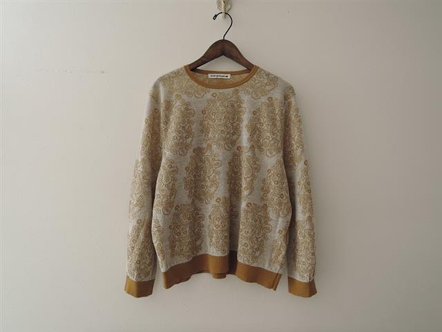 デザイン:mina perhonenのsometimes lucky ニットプルオーバーです。カラーはライトグレー×オーカーで、リネンを主とした糸で軽やかに編み上げたニットで仕立てられています。プルオーバータイプの着脱で、定価は45360円の商品です。