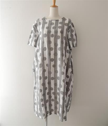 デザイン:mina perhonen laundry「friend」のプリントリネンスモックドレスです。カラーは白×グレーで、リネンであしらわれた、糸節混じりの透け感がある薄手の生地です。後ろの涙開きはボタンループ留めです。両サイドにシームポケットがございます。