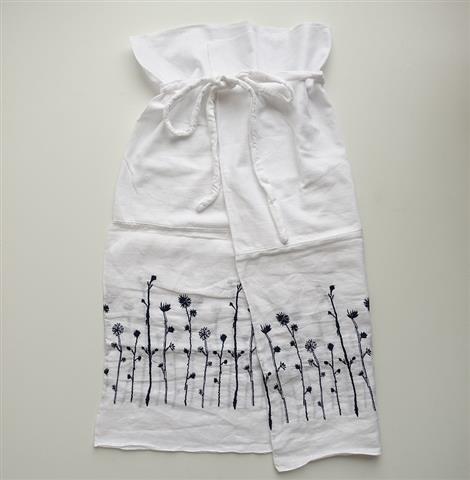 デザイン:mina perhonen×momogusaの「noppara」刺繍入りサロンです。カラーはホワイト×ダークネイビーで、ボーダーの凹凸があり、透け感がある薄手の生地と、糸節混じりのシャリ感がある甘織り生地に、刺繍があしらわれております。別途腰紐付き。筒状のスカートで、ウエスト・着丈は調節可能です。ポケットはございません。