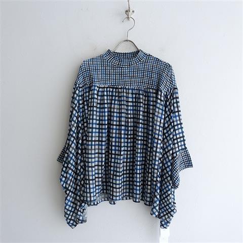 デザイン:2019-20年AWコレクションmina perhonenのminamo スタンドカラープルオーバーです。カラーはブルー・ブラック・ダークグレー・ネイビーグリーン・ライトグレーで、格子柄の落ち感のある薄手カットソー地で仕立てられております。ヨーク下のギャザーでかなりワイドなシルエットになっており、本体価格は36,000円(税抜き)です。