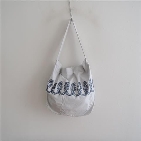デザイン:mina perhonenのribbon ボディバッグ大です。カラーはライトグレーで、ネイビーのテキスタイル刺繍が施されたデザインです。ファスナー開きで、持ち手は2way仕様、内側にはライトブルーの裏地とファスナーポケット付きです。素材:表地/綿50%,絹50% 刺繍/綿100% 裏地/綿100%