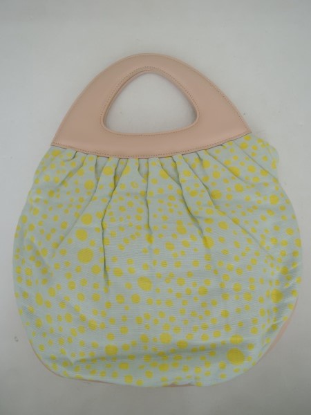 デザイン:minaのシェルバッグです。カラーは淡いパステルグリーン×イエローで、ランダムなドットプリントの中綿入りの生地であしらわれており、底と持ち手はピンクベージュに切替えられております。マグネットボタン開閉で、内側はライトベージュ地に、ポケットが1つ付いております。