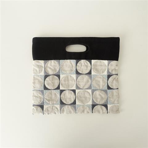デザイン:mina perhonenのpallo フラッグバッグ小です。カラーはライトグレー地ベースに、グレー、ホワイト、チャコール、ライトブルーなどの刺繍が施されたデザインです。dop部分はブラックで、開口部はマグホック仕様です。内側にはグレー系のSleeping Roseの裏地とポケット1つ付きです。指定外繊維(ヘンプ)100%,刺繍と裏地が綿100%,dop部分がポリエステル65%,綿35%です。