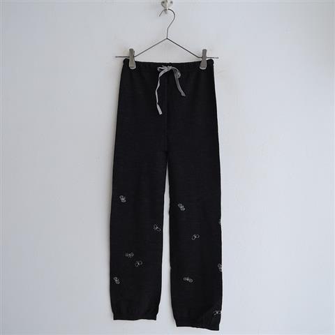 デザイン:mina perhonenのchoucho チョウチョ柄ニットレギンスです。カラーはチャコールグレー×ライトグレーで、チョウチョ柄のニット素材で仕立てられております。ウエストはゴム&ひも入りです。