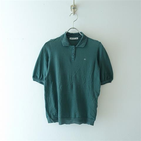 デザイン:mina perhonenのdim air ポロシャツです。カラーはくすんだグリーン(表記green)、薄手鹿の子素材で、フロント半開ボタンです。左胸に蝶々刺繍が施され、定価は18,000円(税抜き)です。