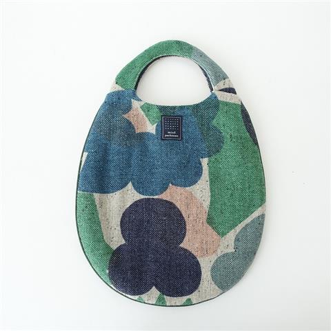 デザイン:mina perhonenのflower basket エッグバッグです。カラーはグリーン、ネイビー、ベージュ、ピンクなどのテキスタイルで、ウォーム感のある素材で仕立てられています。グリーンのパイピングが施され、光沢ベージュの裏地付きです。