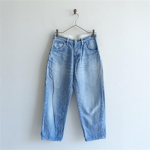 デザイン:mina perhonenのalways デニムパンツです。カラーは褪せたライトインディゴブルーで、ダメージ加工が施されたノンストレッチデニムで仕立てられております。フロント開口部はボタンフライ仕様で、5ポケット、ウエスト裏は「mermaid」のテキスタイル刺繍があしらわれております。ボーイフレンドシルエットになっております。