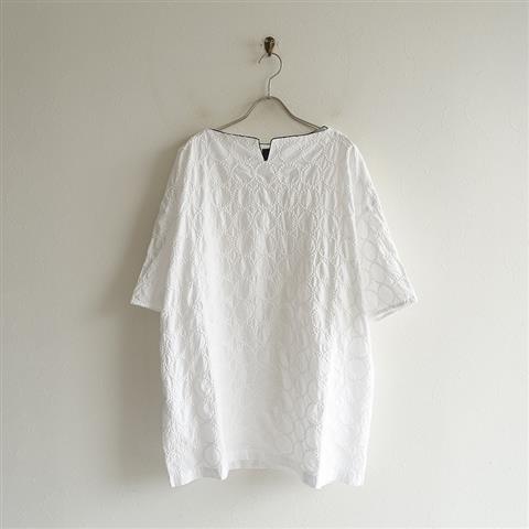 デザイン:mina perhonen「tambourine」のエンブロイダリーキーネックチュニックです。カラーはホワイト×ネイビーで、透け感のある薄手の生地に、膨らんだドットの刺繍があしらわれております。ボートネック風のキーネックラインで、パイピングがあしらわれております。身幅が広くドロップショルダー、両サイドにシームポケットがございます。