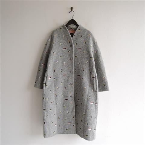デザイン:2019-20年秋冬コレクション mina perhonenのcrystal コートです。カラーはグレーベースにダークブルー・ライトピンク・ライトブラウン・ライトグリーンの光沢ある刺繍入り(表記はライトグレー)で、ブークレー素材です。ボタン開閉で、袖口にボタンは無いデザインです。腰両サイドにシームポケットがあり、裏地付きです。本体価格130,000円の商品です。