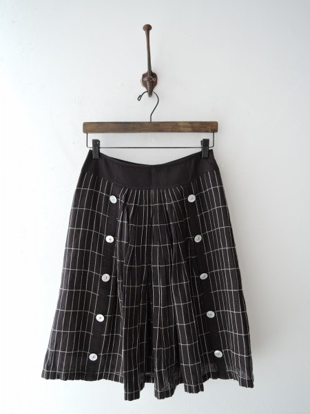 デザイン:mina perhonen 「window」の刺繍スカートです。カラーは褪せ感のあるブラックベースにベージュのチェーン風ステッチが格子状に施された、ガーゼ素材であしらわれております。フロントウエストにプリーツ入りで、フロントには飾りボタン付きです。左ウエストのフック&ファスナーで着脱でき、裏地付きです。 (掲載写真は、実商品のカラーにできるだけ近づけるよう努力はしておりますが、お使いのモニターや画面設定等によっては、色が異なって見える場合もございますので、予めご了承下さい)