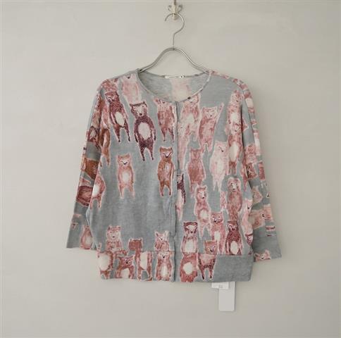 デザイン:mina perhonenのalive カーディガンです。カラーはムラのあるグレーベースにピンクブラウン・パープル・オフホワイトなどの総柄(表記はpink)で、薄手の微起毛ニット地です。ドルマンスリーブデザインで、後ろ裾にギャザーが施されており、フロントのスナップボタン開閉です。本体価格26,000円の商品です。