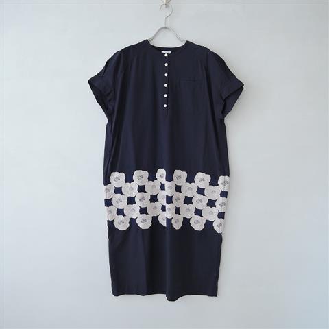 デザイン:mina perhonen laundryのRosas ワンピースです。カラーはネイビーベースにオフホワイトの刺繍入り(表記はnavy)で、布帛地です。フロントの半開ボタンで着脱でき、背上部&袖口上部にタック入りです。腰両サイド&左胸にポケットがあり、裏地は付いておりません。本体価格52,000円の商品です。
