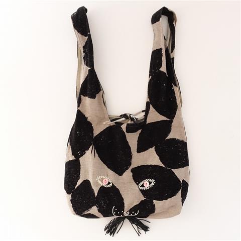 デザイン:mina perhonenのslow dance うさバッグ大です。カラーはグレーベージュ×ブラックで、蝶がゆっくりと舞う様子を空との色のコントラストを際立たせて描いた“slow dance”テキスタイルで、モールの様な起毛素材で仕立てられています。ピンクのボタン、オフホワイトの刺繍、ブラックのレザー調ひもでうさぎさんの顔がデザインされ、開口部はひも結びで、内ポケット1つ付きです。素材は綿100%です。
